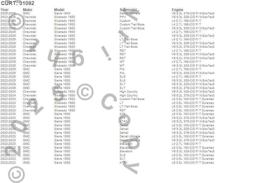 Below is an abbreviated list of applications for the 2 in. Receiver Hitch.Sierra 1500, Silverado 1500, Chevrolet, GMC, 2026, 2025, 2024, 2023, 2022