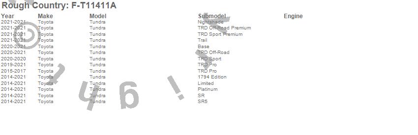 Brand: Rough CountryPart Number: F-T11411AFender Flare Type: Flat Black - 2 in. Tire Coverage - 6 in. Flare HeightUPC: 840269926457