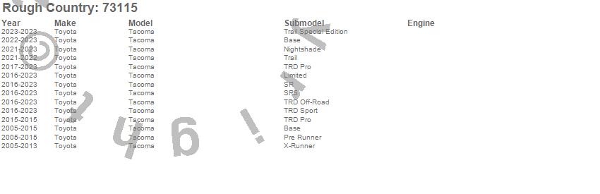 Brand: Rough CountryPart Number: 73115Truck Bed Rack Installation Kit Type: Half Rack - AluminumUPC: 840269925009