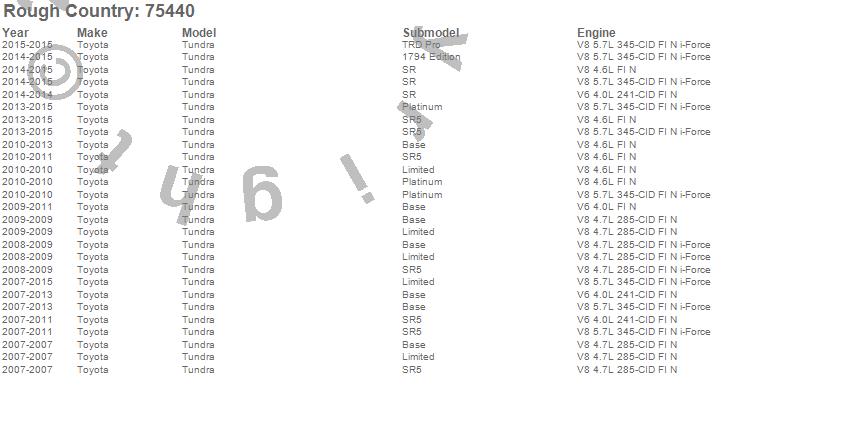 Below is an abbreviated list of applications for the Suspension Lift Kit w/Shocks.Tundra, Toyota, 2015, 2014, 2013, 2012, 2011, 2010, 2009, 2008, 2007