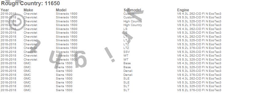 Below is an abbreviated list of applications for the Suspension Lift Kit w/Vertex Shocks.Sierra 1500, Silverado 1500, Chevrolet, GMC, 2018, 2017, 2016