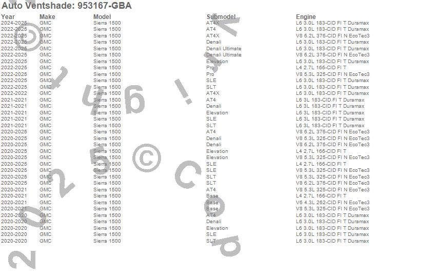 Below is an abbreviated list of applications for the Aeroskin LightShield Pro Hood Protector.Sierra 1500, GMC, 2025, 2024, 2023, 2022, 2021, 2020