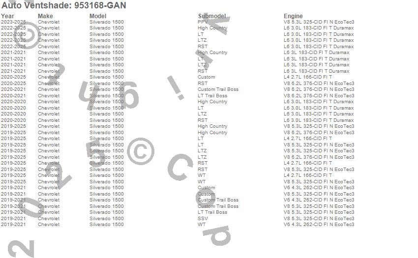 Below is an abbreviated list of applications for the Aeroskin LightShield Pro Hood Protector.Silverado 1500, Chevrolet, 2025, 2024, 2023, 2022, 2021, 2020, 2019
