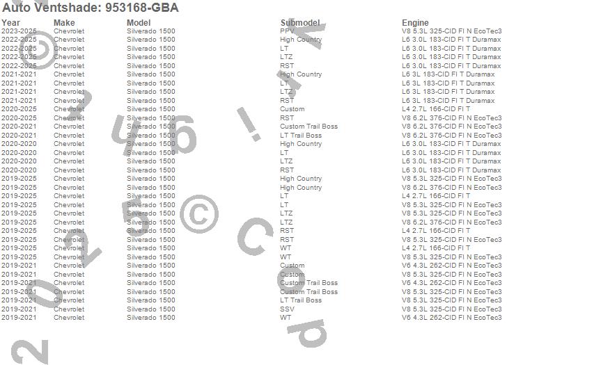 Below is an abbreviated list of applications for the Aeroskin LightShield Color-Match Hood Protector.Silverado 1500, Chevrolet, 2026, 2025, 2024, 2023, 2022, 2021, 2020, 2019