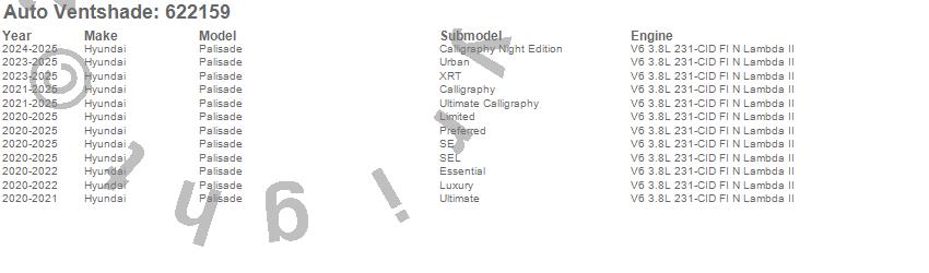 Below is an abbreviated list of applications for the Aeroskin Chrome Hood Protector.Palisade, Hyundai, 2025, 2024, 2023, 2022, 2021, 2020