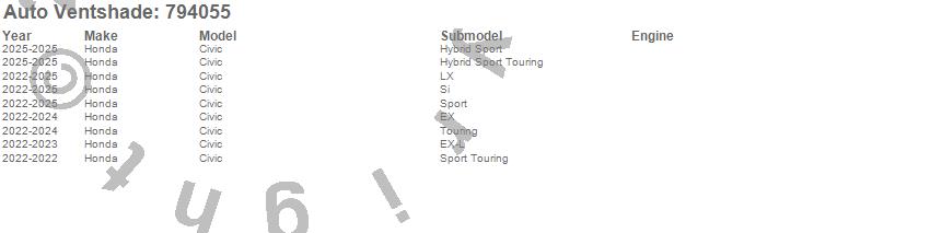 Below is an abbreviated list of applications for the Ventvisor Low Profile Deflector 4 pc..Civic, Honda, 2025, 2024, 2023, 2022
