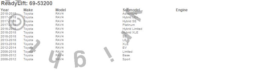Below is an abbreviated list of applications for the SST Lift Kit.RAV4, Toyota, 2018, 2017, 2016, 2015, 2014, 2013, 2012, 2011, 2010, 2009, 2008, 2007, 2006