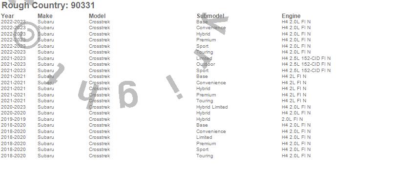 Below is an abbreviated list of applications for the Leveling Kit.Crosstrek, Subaru, 2023, 2022, 2021, 2020, 2019, 2018