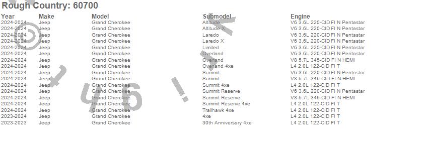 Below is an abbreviated list of applications for the Suspension Lift Kit.Grand Cherokee, Jeep, 2024, 2023
