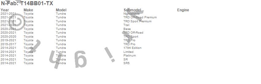 Below is an abbreviated list of applications for the HVM Bull Bar.Tundra, Toyota, 2021, 2020, 2019, 2018, 2017, 2016, 2015, 2014