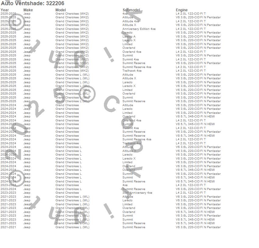 Below is an abbreviated list of applications for the Aeroskin Smoke Hood Protector.Grand Cherokee, Grand Cherokee (WK2), Grand Cherokee (WL), Grand Cherokee L, Grand Cherokee L (WL), Jeep, 2025, 2024, 2023, 2022, 2021