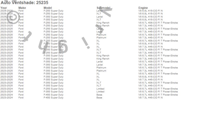 Below is an abbreviated list of applications for the Bugflector II Hood Shield.F-250 Super Duty, F-350 Super Duty, F-450 Super Duty, F-550 Super Duty, Ford, 2026, 2025, 2024, 2023