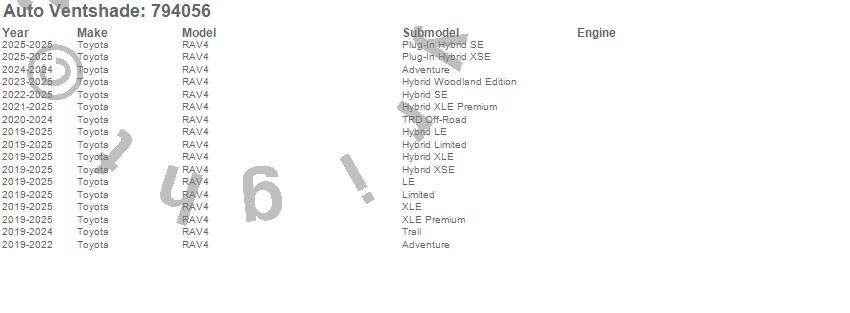 Below is an abbreviated list of applications for the Ventvisor Low Profile Deflector 4 pc..RAV4, Toyota, 2025, 2024, 2023, 2022, 2021, 2020, 2019
