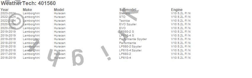 Below is an abbreviated list of applications for the Cargo Liner.Huracan, Lamborghini, 2024, 2023, 2022, 2021, 2020, 2019, 2018, 2017, 2016
