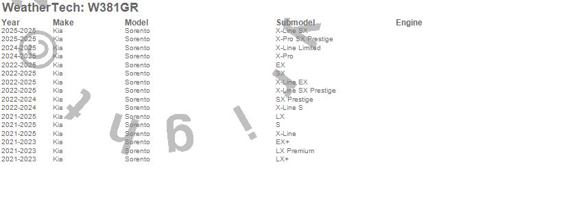 Below is an abbreviated list of applications for the All Weather Floor Mats.Sorento, Kia, 2025, 2024, 2023, 2022, 2021