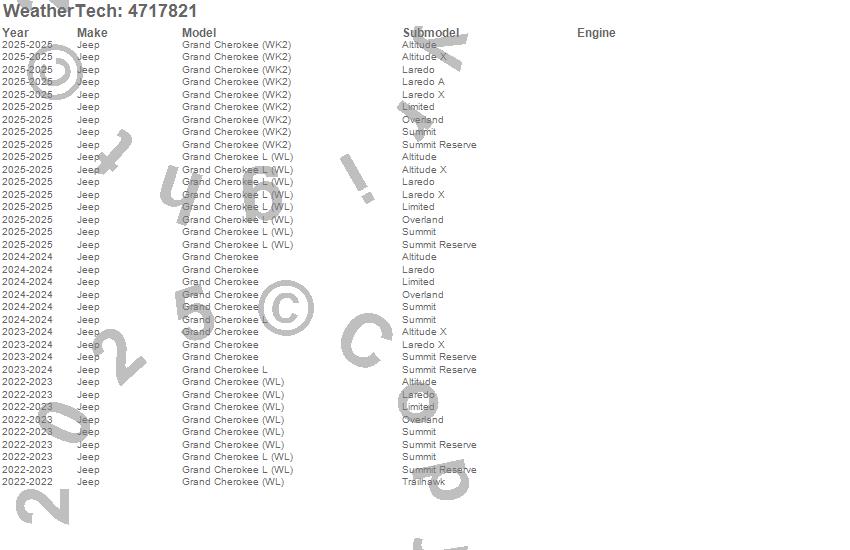 Below is an abbreviated list of applications for the FloorLiner DigitalFit.Grand Cherokee, Grand Cherokee (WK2), Grand Cherokee (WL), Grand Cherokee L, Grand Cherokee L (WL), Jeep, 2025, 2024, 2023, 2022