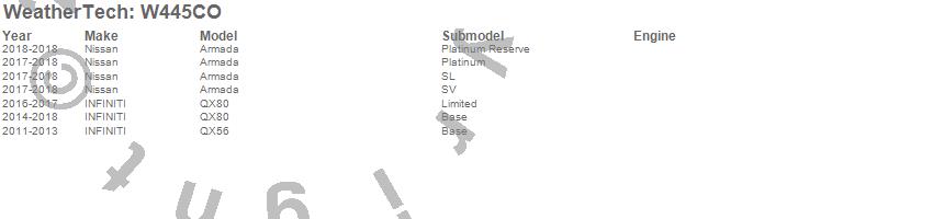 Below is an abbreviated list of applications for the All Weather Floor Mats.Armada, QX56, QX80, INFINITI, Nissan, 2018, 2017, 2016, 2015, 2014, 2013, 2012, 2011