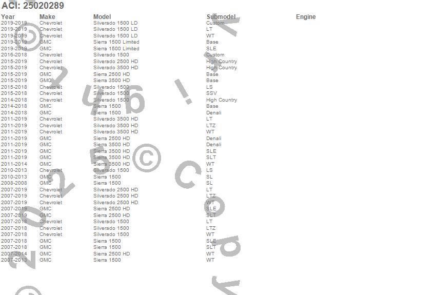 Brand: ACIPart Number: 25020289Truck Bed Mat Type: UPC: 834532004287
