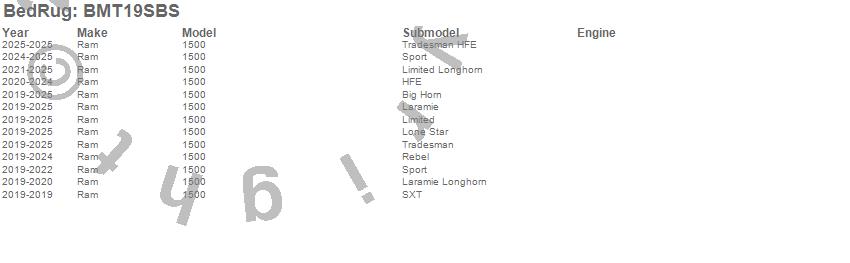Brand: BedRugPart Number: BMT19SBSTruck Bed Mat Type: 3/4 in. Thick - For Use w/Spray On Bed Liner And Non Liner ApplicationsUPC: 870558006652
