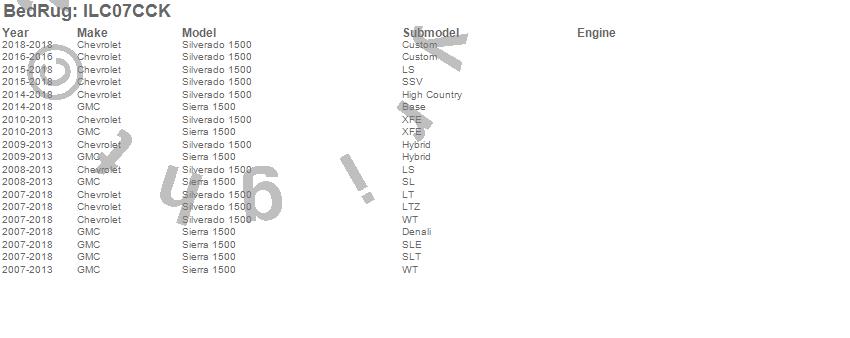Below is an abbreviated list of applications for the Impact Bed Liner.Sierra 1500, Silverado 1500, Chevrolet, GMC, 2018, 2017, 2016, 2015, 2014, 2013, 2012, 2011, 2010, 2009, 2008, 2007
