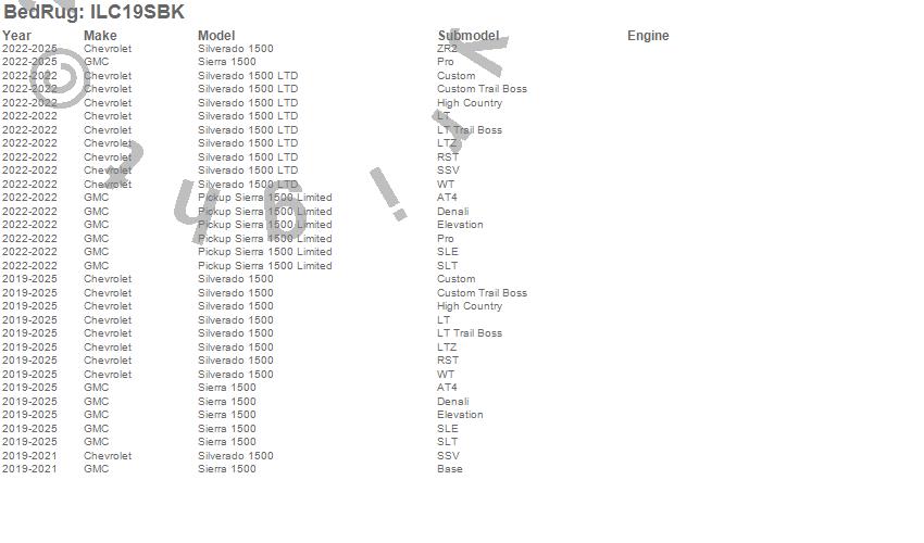 Below is an abbreviated list of applications for the Impact Bed Liner.Pickup Sierra 1500 Limited, Sierra 1500, Silverado 1500, Silverado 1500 LTD, Chevrolet, GMC, 2025, 2024, 2023, 2022, 2021, 2020, 2019