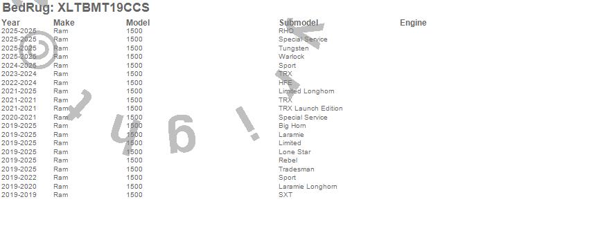 Brand: BedRugPart Number: XLTBMT19CCSTruck Bed Mat Type: For Use w/Spray On Bed Liner And Non Liner ApplicationsUPC: 870558006690