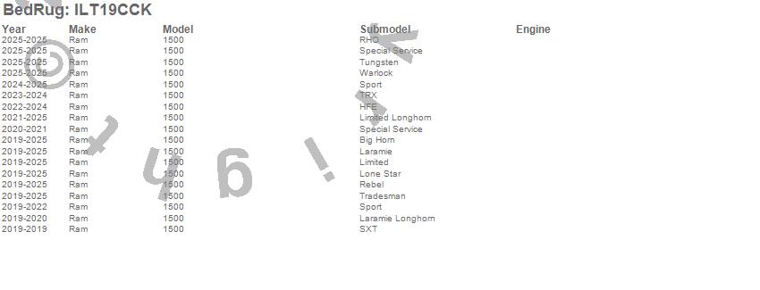 Brand: BedRugPart Number: ILT19CCKTruck Bed Liner Type: For Use w/Spray On Bed Liner And Non Liner ApplicationsUPC: 870558006393
