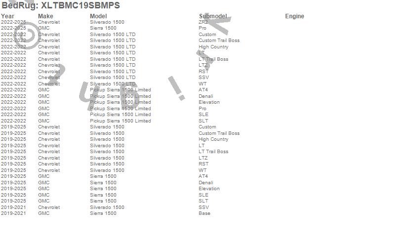 Below is an abbreviated list of applications for the XLT Mat.Pickup Sierra 1500 Limited, Sierra 1500, Silverado 1500, Silverado 1500 LTD, Chevrolet, GMC, 2025, 2024, 2023, 2022, 2021, 2020, 2019