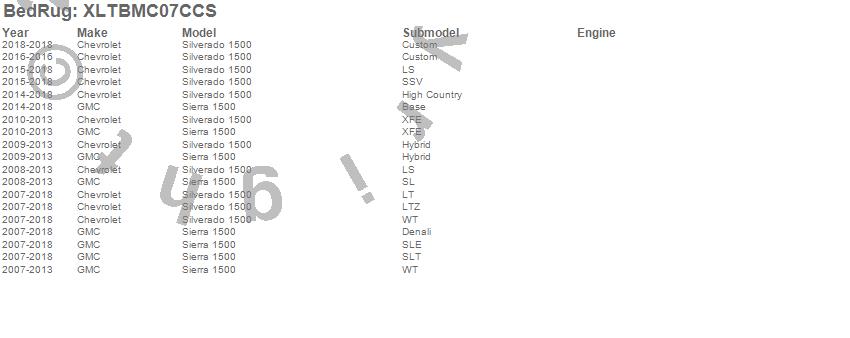 Below is an abbreviated list of applications for the XLT Mat.Sierra 1500, Silverado 1500, Chevrolet, GMC, 2018, 2017, 2016, 2015, 2014, 2013, 2012, 2011, 2010, 2009, 2008, 2007