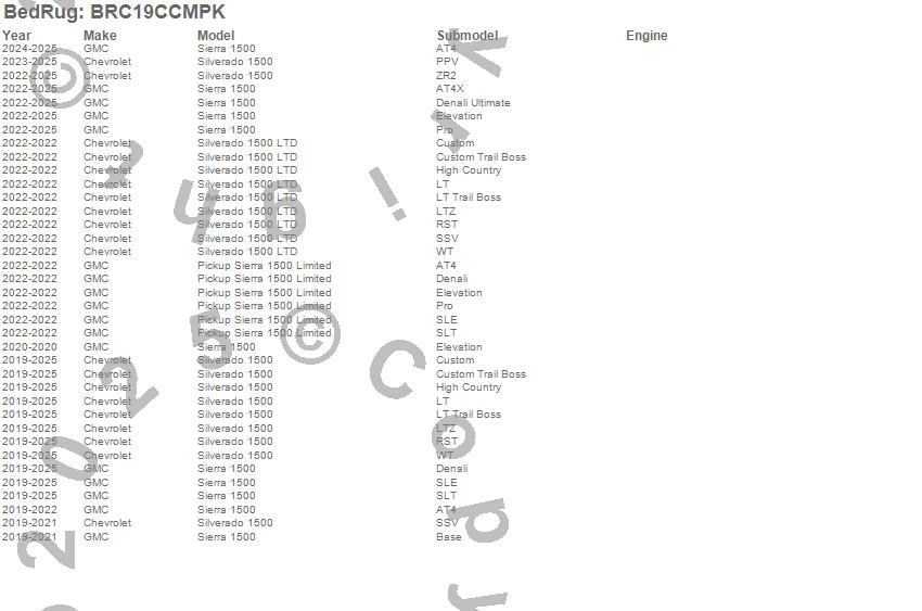 Below is an abbreviated list of applications for the BedRug Truck Bed Liner.Pickup Sierra 1500 Limited, Sierra 1500, Silverado 1500, Silverado 1500 LTD, Chevrolet, GMC, 2025, 2024, 2023, 2022, 2021, 2020, 2019