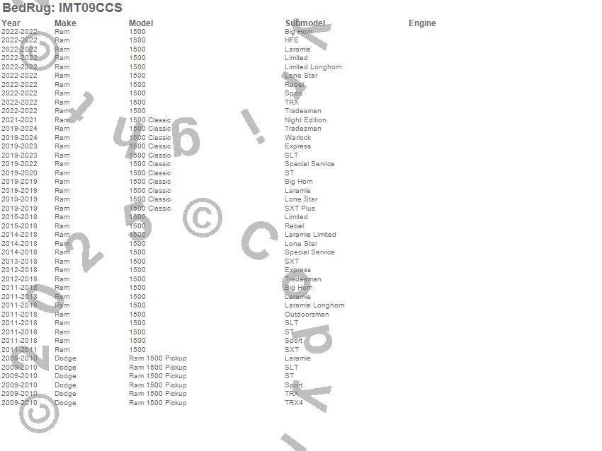 Brand: BedRugPart Number: IMT09CCSTruck Bed Mat Type: For Use w/Spray On Bed Liner And Non Liner Applications - w/o Ram Box StorageUPC: 870558006010