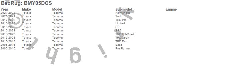 Below is an abbreviated list of applications for the BedRug Floor Truck Bed Mat.Tacoma, Toyota, 2023, 2022, 2021, 2020, 2019, 2018, 2017, 2016, 2015, 2014, 2013, 2012, 2011, 2010, 2009, 2008, 2007, 2006