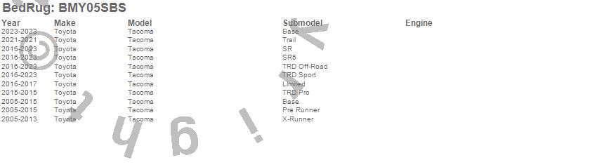 Below is an abbreviated list of applications for the BedRug Floor Truck Bed Mat.Tacoma, Toyota, 2023, 2022, 2021, 2020, 2019, 2018, 2017, 2016, 2015, 2014, 2013, 2012, 2011, 2010, 2009, 2008, 2007, 2006