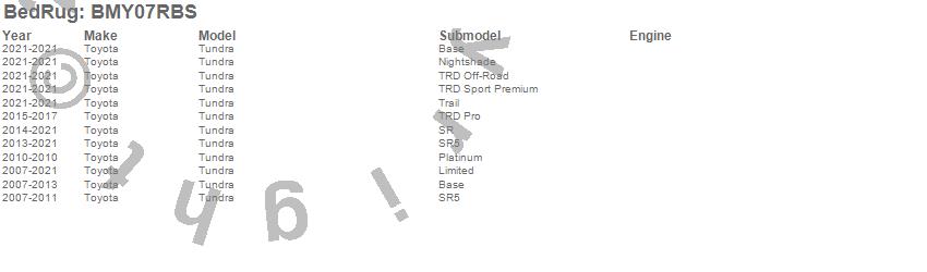 Below is an abbreviated list of applications for the BedRug Floor Truck Bed Mat.Tundra, Toyota, 2021, 2020, 2019, 2018, 2017, 2016, 2015, 2014, 2013, 2012, 2011, 2010, 2009, 2008, 2007