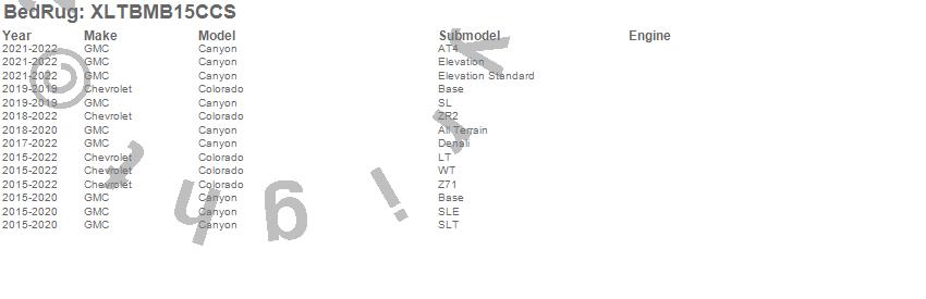 Brand: BedRugPart Number: XLTBMB15CCSTruck Bed Mat Type: For Use w/Spray On Bed Liner And Non Liner ApplicationsUPC: 870558006027