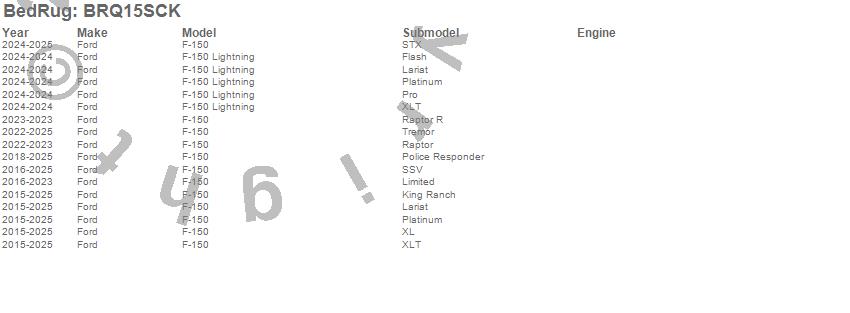 Below is an abbreviated list of applications for the BedRug Complete Truck Bed Liner.F-150, F-150 Lightning, Ford, 2025, 2024, 2023, 2022, 2021, 2020, 2019, 2018, 2017, 2016, 2015