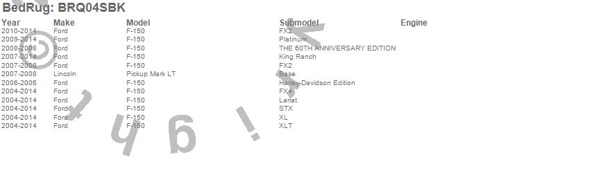 Below is an abbreviated list of applications for the BedRug Complete Truck Bed Liner.F-150, Mark LT, Ford, Lincoln, 2014, 2013, 2012, 2011, 2010, 2009, 2008, 2007, 2006, 2005, 2004