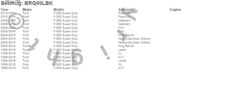 Below is an abbreviated list of applications for the BedRug Complete Truck Bed Liner.F-250 Super Duty, F-350 Super Duty, Ford, 2016, 2015, 2014, 2013, 2012, 2011, 2010, 2009, 2008, 2007, 2006, 2005, 2004, 2003, 2002, 2001, 2000
