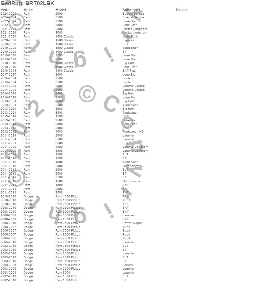 Below is an abbreviated list of applications for the BedRug Complete Truck Bed Liner.1500, 1500 Classic, 2500, 3500, Ram 1500, Ram 2500, Ram 3500, Dodge, Ram, 2024, 2023, 2022, 2021, 2020, 2019, 2018, 2017, 2016, 2015, 2014