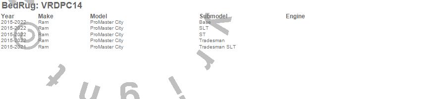 Below is an abbreviated list of applications for the VanRug Cargo Mat.ProMaster City, Ram, 2022, 2021, 2020, 2019, 2018, 2017, 2016, 2015