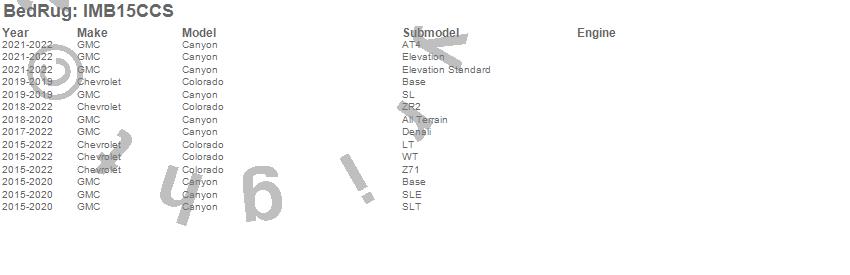 Brand: BedRugPart Number: IMB15CCSTruck Bed Mat Type: For Use w/Spray On Bed Liner And Non Liner ApplicationsUPC: 870558006164