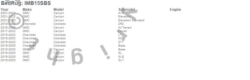 Brand: BedRugPart Number: IMB15SBSTruck Bed Mat Type: For Use w/Spray On Bed Liner And Non Liner ApplicationsUPC: 870558006171