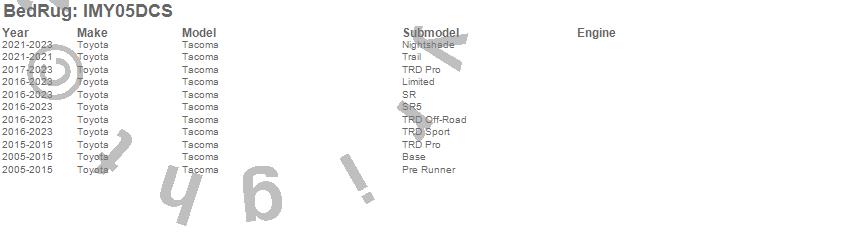 Brand: BedRugPart Number: IMY05DCSTruck Bed Mat Type: For Use w/Spray On Bed Liner And Non Liner ApplicationsUPC: 870558006256