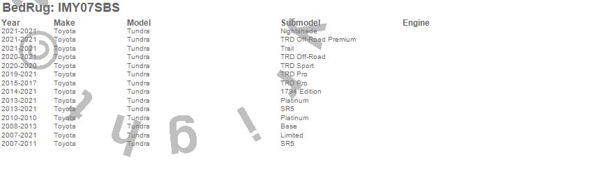 Brand: BedRugPart Number: IMY07SBSTruck Bed Mat Type: For Use w/Spray On Bed Liner And Non Liner ApplicationsUPC: 870558006294