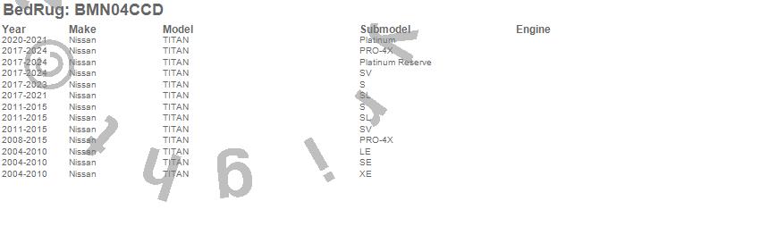 Below is an abbreviated list of applications for the BedRug Floor Truck Bed Mat.TITAN, Nissan, 2024, 2023, 2022, 2021, 2020, 2019, 2018, 2017, 2015, 2014, 2013, 2012, 2011, 2010, 2009, 2008, 2007, 2006