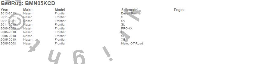 Below is an abbreviated list of applications for the BedRug Floor Truck Bed Mat.Frontier, Nissan, 2021, 2020, 2019, 2018, 2017, 2016, 2015, 2014, 2013, 2012, 2011, 2010, 2009, 2008, 2007, 2006, 2005
