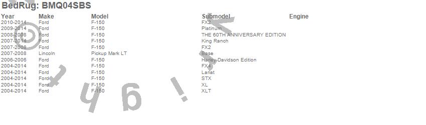 Below is an abbreviated list of applications for the BedRug Floor Truck Bed Mat.F-150, Mark LT, Ford, Lincoln, 2014, 2013, 2012, 2011, 2010, 2009, 2008, 2007, 2006, 2005, 2004