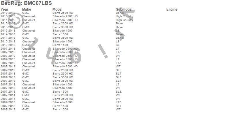 Below is an abbreviated list of applications for the BedRug Floor Truck Bed Mat.Sierra 1500, Sierra 2500 HD, Sierra 3500 HD, Silverado 1500, Silverado 2500 HD, Silverado 3500 HD, Chevrolet, GMC, 2019, 2018, 2017, 2016, 2015, 2014, 2013, 2012, 2011, 2010, 2009, 2008