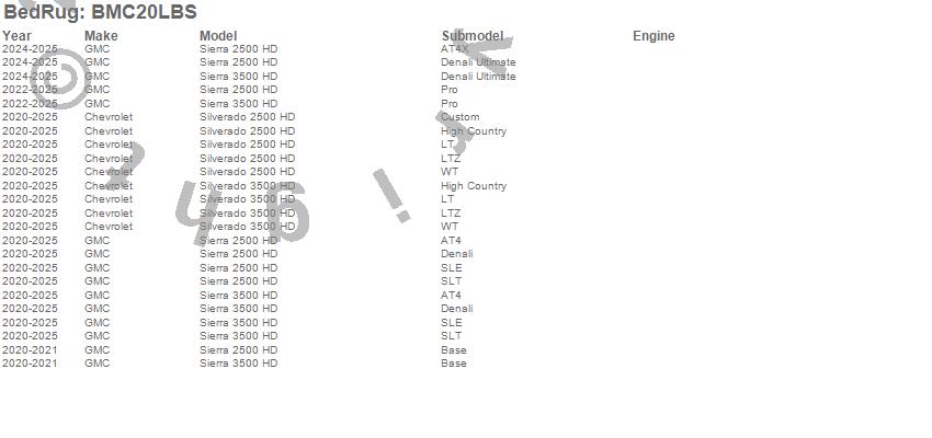 Below is an abbreviated list of applications for the BedRug Floor Truck Bed Mat.Sierra 2500 HD, Sierra 3500 HD, Silverado 2500 HD, Silverado 3500 HD, Chevrolet, GMC, 2025, 2024, 2023, 2022, 2021, 2020