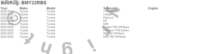 Below is an abbreviated list of applications for the BedRug Floor Truck Bed Mat.Tundra, Toyota, 2025, 2024, 2023, 2022